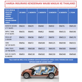 Kereta 4-5 tempat duduk 9 hari RM67 1 bulan RM80 3 bulan RM105 6 bulan RM130 1 tahun RM170 Insurans beserta Kad TM6 akan di pos menggunakan Pos Laju Borang TM2 TM3 Surat Kebenaran pemilik kenderaan serta panduan mengisi borong akan di hantar melalui e-mail. Kadar insurans bergantung pada bilangan hari contoh 5 hari berharga RM28 Borang white card RM2 bagi satu orang CARA MASUK THAILAND. Sijil pemilikan kenderaan.